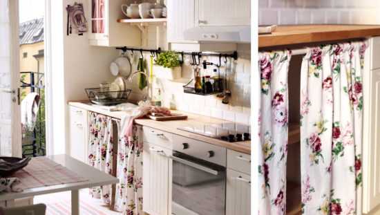 - Узор, подходящий и для кухонного фартука, могут содержать шторы. Скорее всего, это будет ненавязчивый орнамент, который применим и для ажурной отделки остального помещения.