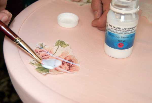 - На выбранные места требуется приклеить картинки. С этой целью применяют клей ПВА, разбавленный водой. Клеем проклеивают саму картинку и прикрепляют ее на свое место. Картинку аккуратно проглаживают кусочком ткани, чтобы не образовалось никаких замятин и пузырей. Можно пройтись разбавленным клеем и поверх картинки,
