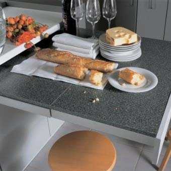 Во-вторых, выдвижной телескопический стол — весьма практичный способ заметно увеличить полезную площадь столешницы. Во время готовки на него удобно ставить посуду, положить продукты, кулинарную книгу, поставить мясорубку или блендер. Вдобавок он может выступать в качестве дополнительной разделочной доски. Дополнительная рабочая поверхность значительно облегчит жизнь хозяйке и сделает пребывание на кухне более удобным.