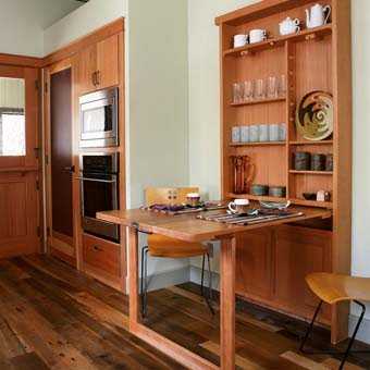 Встроенная мебель прекрасно подходит для интерьера любой кухни. Выдвижной стол может стать как вашим обеденным столом, так и увеличить рабочую поверхность кухонного стола.