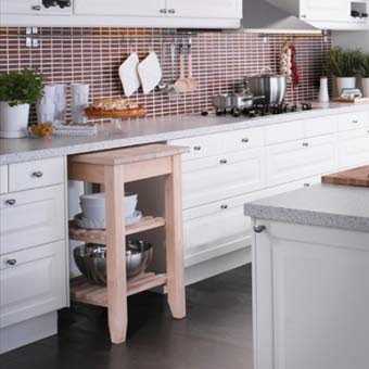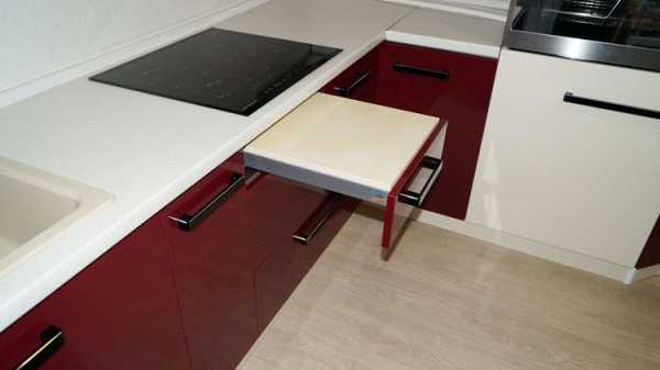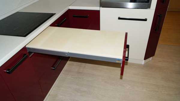 Конструкция встроенного столика очень компактна, проста и надежна. Выдвижная столешница передвигается по направляющим. Как правило, она располагается чуть ниже уровня основной столешницы, но в сложенном наполовину виде может образовывать с ней единую плоскость. Такой вариант особенно удобен для хозяйки в процессе готовки.