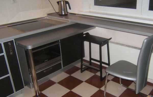Более бюджетный вариант — выдвижная столешница с дополнительной ножкой-опорой. Такими столиками иногда дополняют кухонные гарнитуры для маленькой кухни в хрущевке. Подобный элемент мебели всегда изготавливают на заказ. Как правило, используется несложный механизм: когда стол не нужен, столешница по направляющим задвигается под рабочую поверхность, а ножка-опора уходит в специальную нишу.