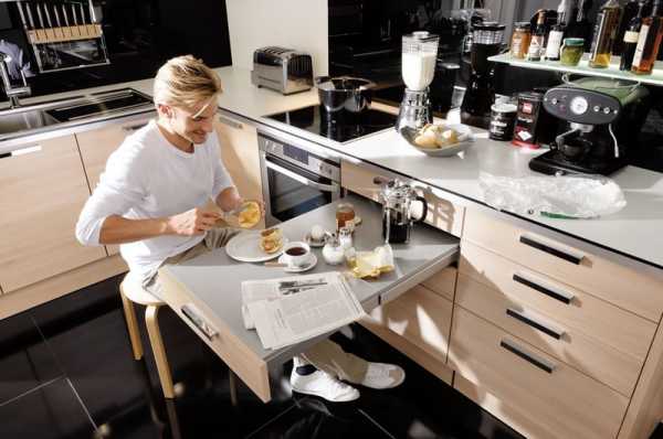 Выдвижной стол на кухне очень экономит место, позволяя разумно использовать каждый сантиметр.