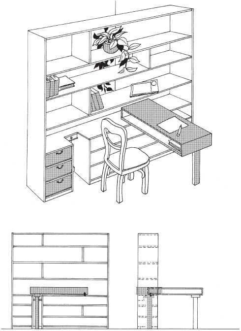 При оформлении квартир всегда пользовались успехом решения, позволяющие экономить полезную площадь. В то же время нередко возникает необходимость оборудовать в квартире место, где никто не мешал бы делать письменные работы. В многочисленных «стенках» есть секретеры и маленькие вставные доски, на которых можно выполнять письменные работы. Однако секретеры не особенно рассчитаны на то, чтобы делать на них большие работы, а вставные доски занимают в стенке слишком много места, которое можно было бы использовать более рационально. Поэтому мы предлагаем свою конструкцию. Это высокий комбинированный шкаф, который может быть установлен поперек помещения (в большой комнате он может одновременно играть роль перегородки), а может и стоять вдоль стены. В этом шкафу мы оборудуем выдвижной письменный стол.