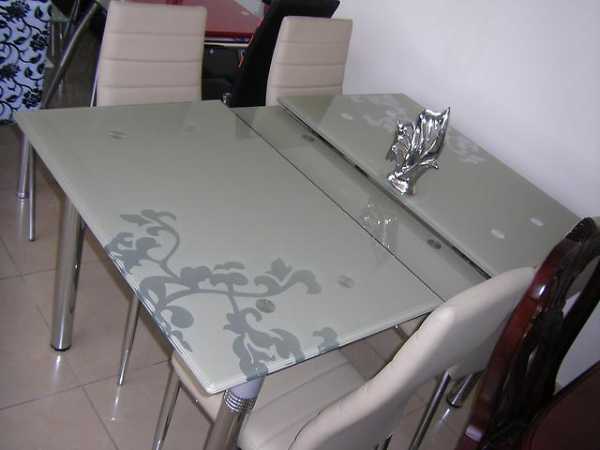Очень популярными являются столы со стеклянной столешницей. Долговечность такого стола зависит от того, как к нему будут относиться хозяева. Несмотря на то, что толщина столешницы довольно внушительная, стекло требует бережного отношения. А если стеклянный раздвижной стол гармонирует с остальной установленной в кухне мебелью, то это будет прекрасным решением. Стол из стекла хорошо моется.