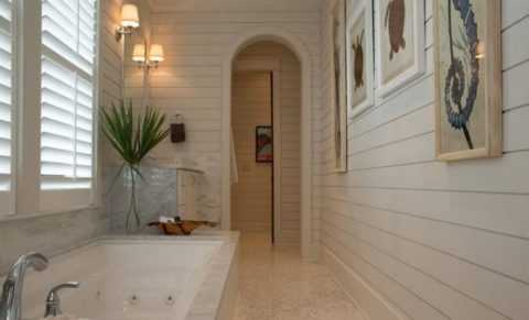 Используется вагонка и в отделке ванных комнат. Пропитке тут необходимо уделить максимум внимания, но если вентиляцию в ванной сделать на уровне, пропитку — с защитой от влаги, то проблем быть не должно. А интерьер, согласитесь, очень интересный — теплые тона древесины в сочетании с ярким мрамором — отличный ход.