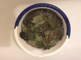 Снимаем аккуратно все листики, кладём их в контейнер или ведро, заливаем кипятком.