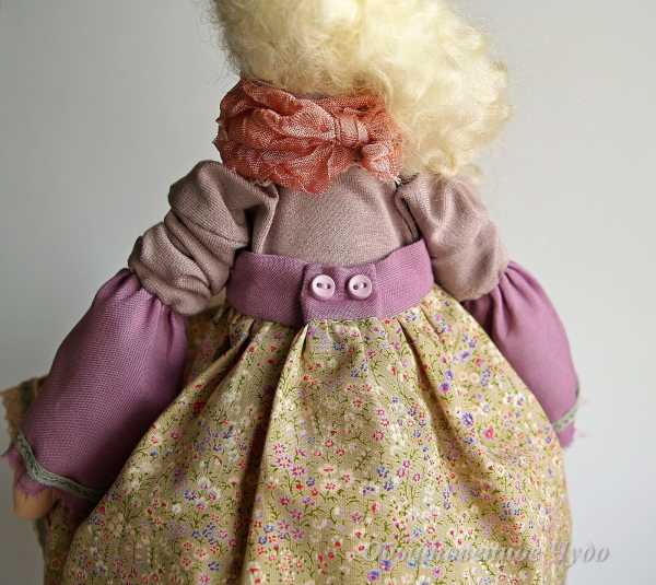 За основу взяла банную Тильду, волосы натуральные шерстяные куряшки, ткани штапель (лавандовая) и батист (оливковая), трикотаж (гольфики), типа искусственные мех (шубейка из каракуля прям ;)))), валенки из фетра, кружева, мелкие пуговки.