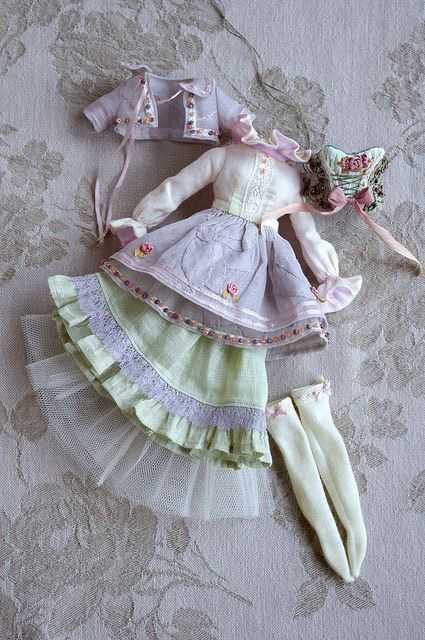 Истинный шебби-шик и прованс характеризуются использованием нежной цветовой палитры без «кричащих» оттенков. Зефирно-розовый, небесно-синий, светло-лимонный, лавандовый или мятный — идеальные цвета для платья женственной куклы.