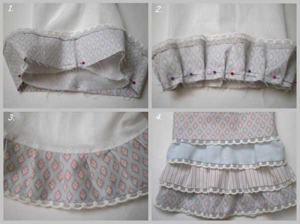 К основе пришиваю первую оборку – нижний ярус юбки. Сзади делаю небольшой шлейф. Низ обшиваю кружевом.