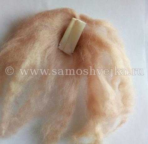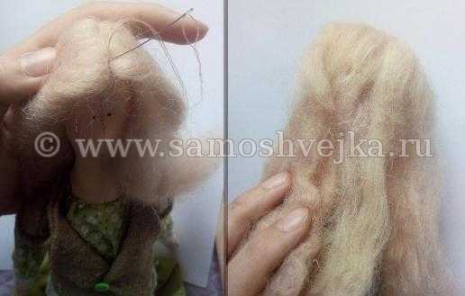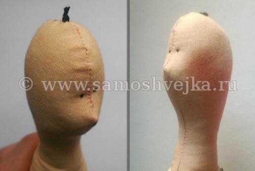 Глазки делаю из черной нитки мулине. Иголку с ниткой пропускаю сквозь голову куклы и закрепляю на макушке. Все узелки все равно спрячутся под волосами. Красным карандашом рисую румянец. Щечки можно нарумянить также настоящей косметикой или гуашью, растерев ее кусочком ткани или ваты.
