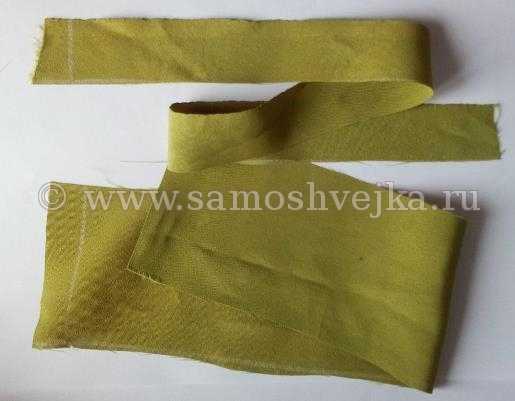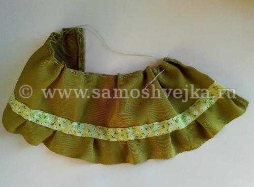 Верхний ярус отличается от других. Это скорее не ярус, а маленькая юбочка с разрезом на правой стороне. Ее я шью из двух полосок зеленой ткани – широкая полоска короче узкой.