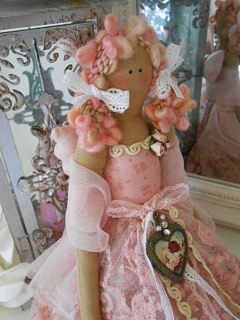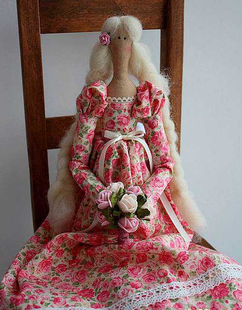 - Декор. Нежная вышивка, элементы вязания крючком, изящные кружева фриволите, характерный цветочный принт и многое другое с успехом дополнят романтичный образ стильной куклы. Из украшения тряпичной красавице подойдут стеклянные, деревянные или фарфоровые бусы.