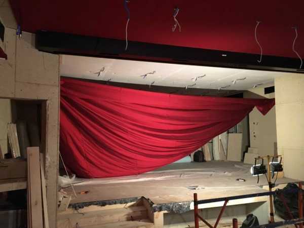В потолке около 60 отверстий для светильников и сценического света. Провода для оборудования настолько длинные, что их нельзя разместить в подрозетниках на время работ с тканью. Очень хотелось бы сделать их короче, но не получилось. Такая длина нужна для монтажа техники. Чтобы ткань натянулась, в ней нужно сделать отверстия и протянуть в них провода. То есть сначала прорезаем ткань, протягиваем выводы проводов, а потом натягиваем ткань.