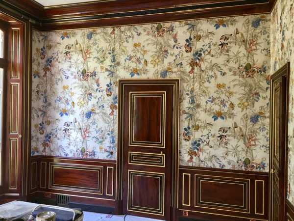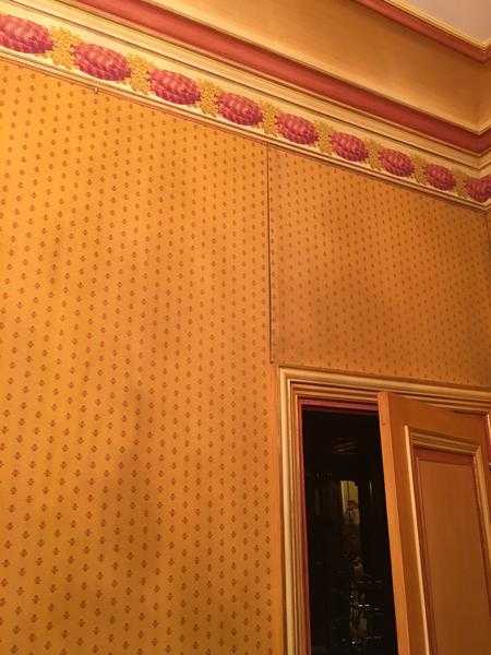 Раньше на стенах был шелк, а дерево окрашено в бежево-розовые тона. Здание историческое, почти музей. Просто так ничего сделать нельзя. Что бы провести работы, наш заказчик получал разрешение от местных властей на ремонт.