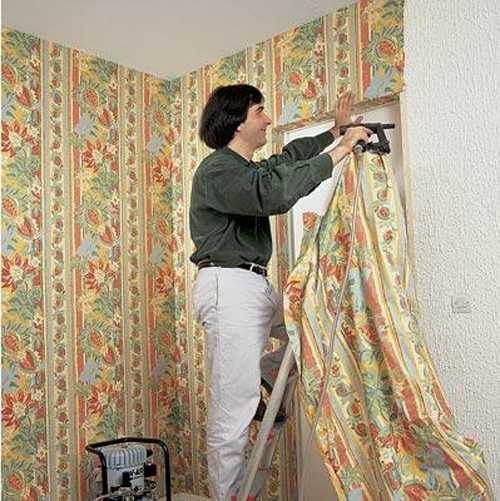- Дальше клеем обмазывается верхний край стены полосой в 10 см. помощник разматывает рулон ткани, вы прижимаете текстиль к клею, прокатывая эти места валиком. Напоминаем – для лучшей фиксации можно закрепить место приклеивания деревянной рейкой.
