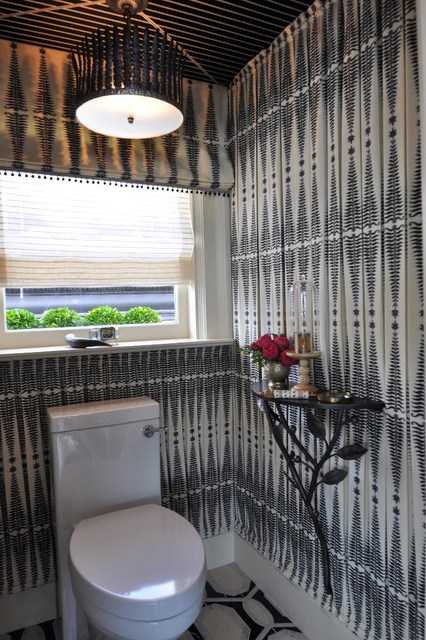 - Если в санузле низкий потолок, то визуально увеличить высоту комнаты помогут обои с вертикальными полосами или любые другие материалы с таким же рисунком. Обои же с горизонтальными полосками могут расширить пространство;