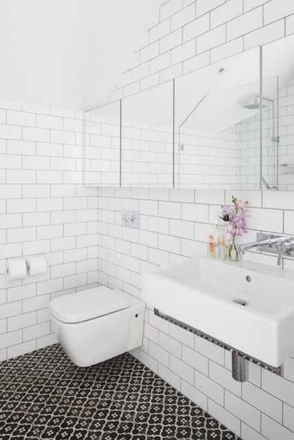 Для разнообразия желательно включить в цвета облицовки темно-серый и светло-серый тона, сделав на стене, облицованной глянцевой белой плиткой, темно-серую вертикальную вставку с матовой или рифленой поверхностью. Дизайн отдельного маленького туалета с черным унитазом выигрывает: