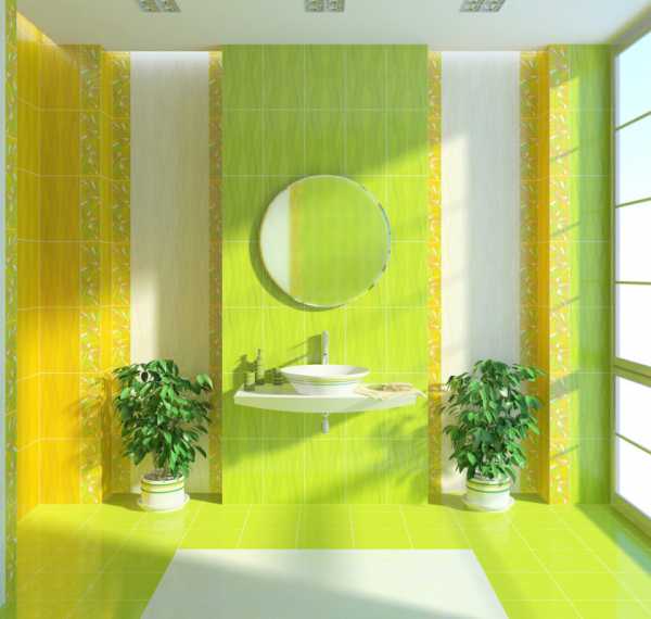 Интерьер зеленой ванной комнаты оформляют в тропических мотивах. Используйте сочетание желто — изумрудных оттенков.