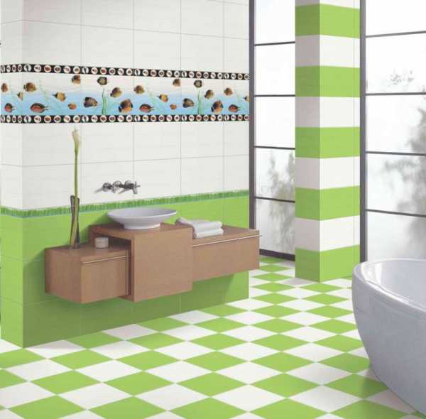 Боковая стена поскромнее. Одна полоса зеленой плитки, все остальное — белое.