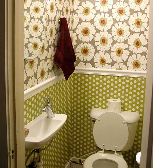 В некоторых европейских странах уже не редкость использование в туалете влагостойких обоев. Этой идеей можно воспользоваться и подобрать себе светлые обои с некрупным рисунком.