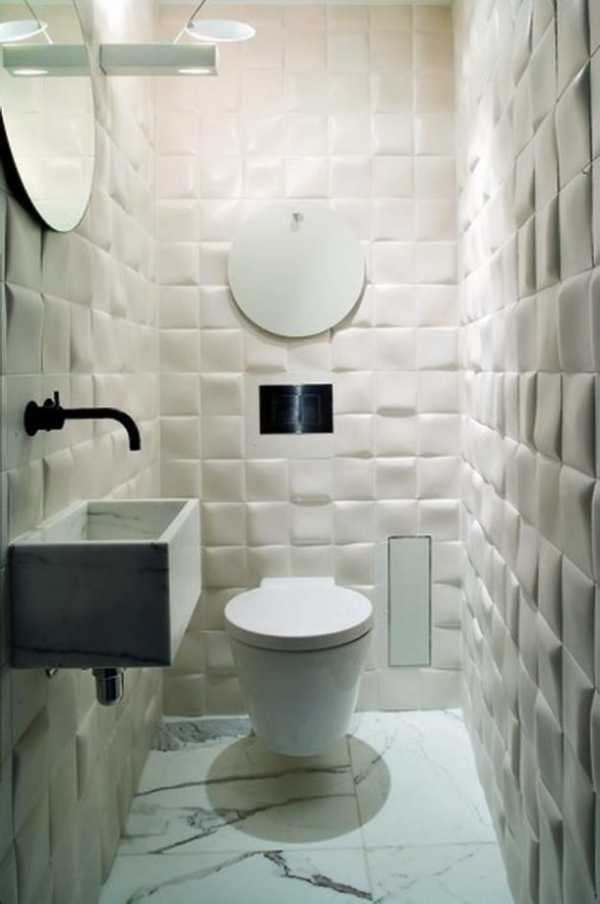 Оставляя традиционную белую сантехнику, можно создать иллюзию туалета вполне нормального размера за счет удачно выбранной цветовой палитры потолка, настенной и напольной плитки, грамотного подхода к освещению.