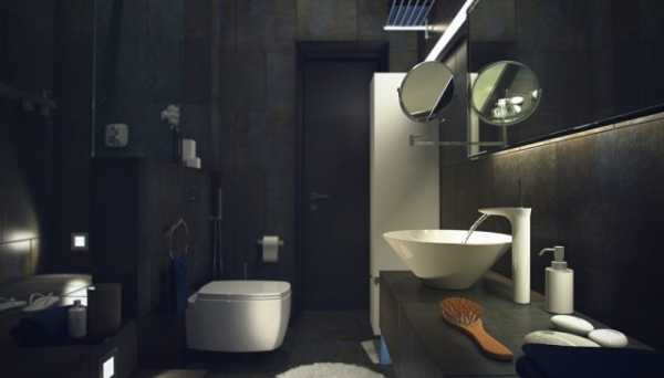 Черная чаша в любом случае выглядит смело и эффектно, но создать для него соответствующий антураж довольно сложно, несмотря на универсальный характер цветовых сочетаний. Стандартный подход – черно-белые стены, пол и потолок – может показаться слишком банальным, но можно сделать акценты на ярких аксессуарах: блестящих хромированных элементах светильников, держателях для бумаги, ершике с подставкой, контейнере для мусора.