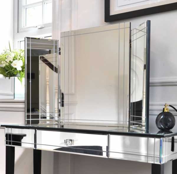 - Трельяж – столик с трехстворчатым зеркалом. Подвижность боковых частей позволяет менять угол их размещения, что даст возможность рассмотреть себя со всех сторон.
