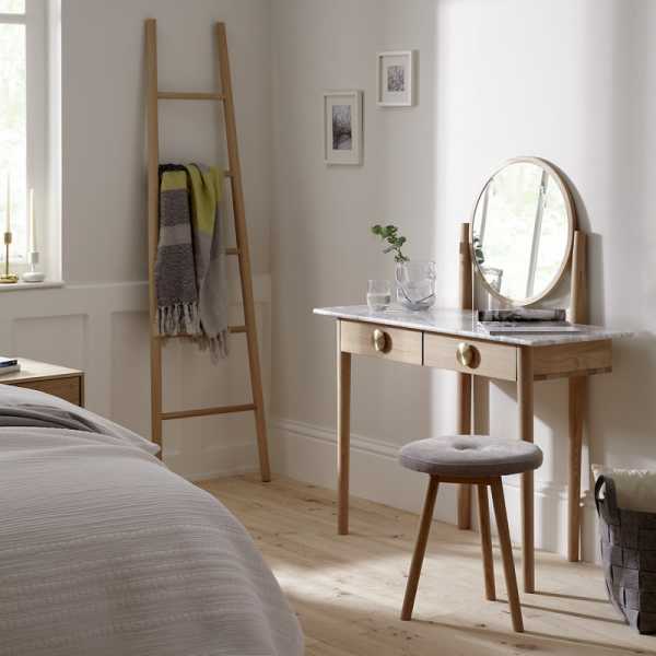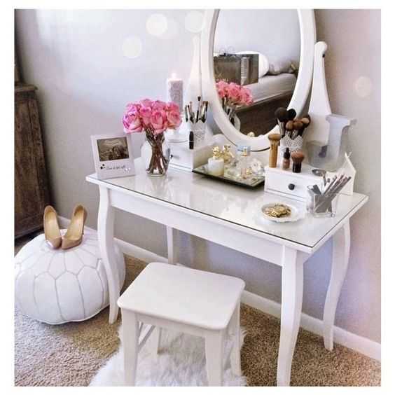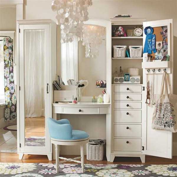 Обратите внимание на угловые туалетные столики, если у вас небольшая комната. Они не будут занимать много места, и у вас останется больше свободного пространства.