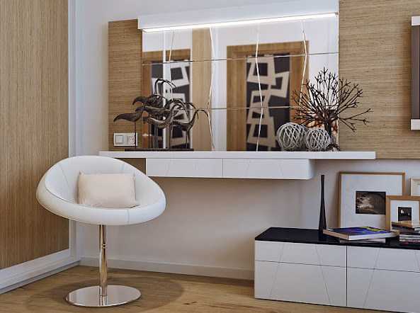 Для комнаты небольших размеров компактный туалетный столик будет в самый раз. Это может быть необычное трюмо в виде раскладного стола. Зеркало в этом случае можно повесить на стену.