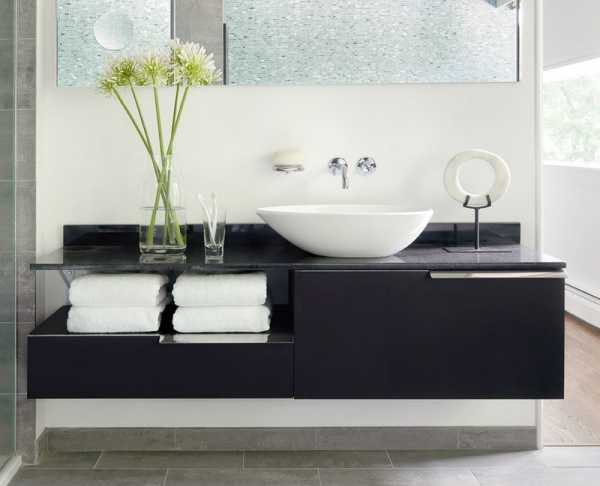 Желающим придать интерьеру определенную экстравагантность, можно посоветовать обратить внимание на подвесные накладные раковины с тумбой. Особенно их рекомендуется использовать, если ванная комната оборудована системой отопления «теплый пол». В таком случае шкаф даже после нескольких лет эксплуатации не деформируется и не рассохнется.
