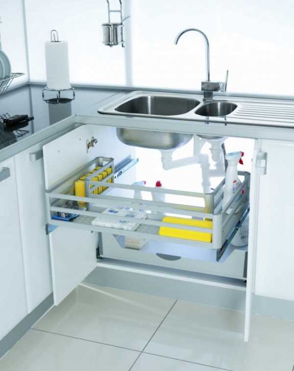 Как правило, под умывальниками в ванной хранят всевозможные чистящие средства, стиральные порошки и прочую бытовую химию. Если шкаф расположен на кухне, то традиционно в нем стоит мусорное ведро.