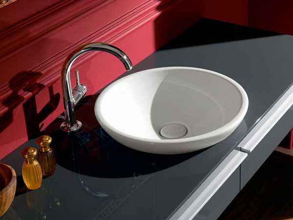 Особенностью накладной раковины является способ расположения. Ее устанавливают на поверхности столешницы, которая оборудована отверстием для сифона. В этом случае не требуется тщательная герметизация щели между столешницей и умывальником.