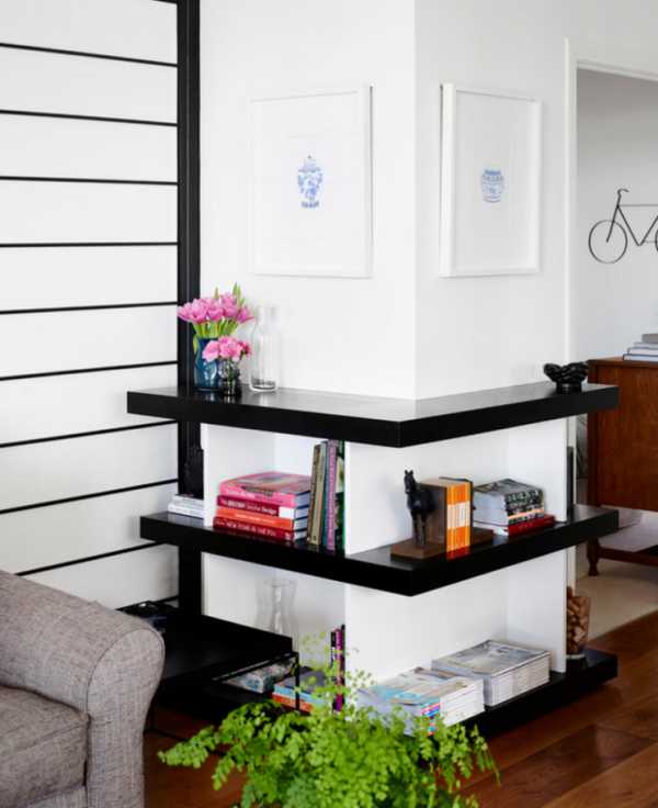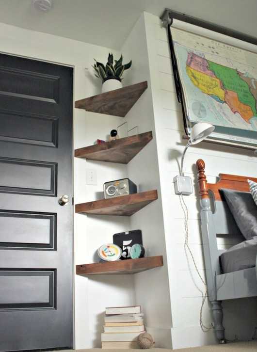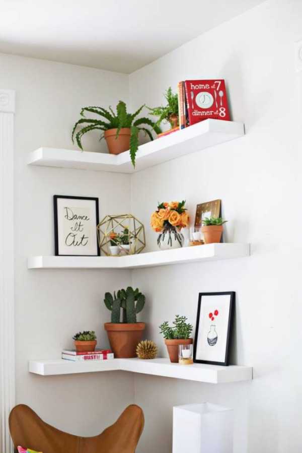 Помещения с полками, расположенными в углу, выглядит убрано и стильно. При помощи полок можно структурировать порядок предметов в комнате.