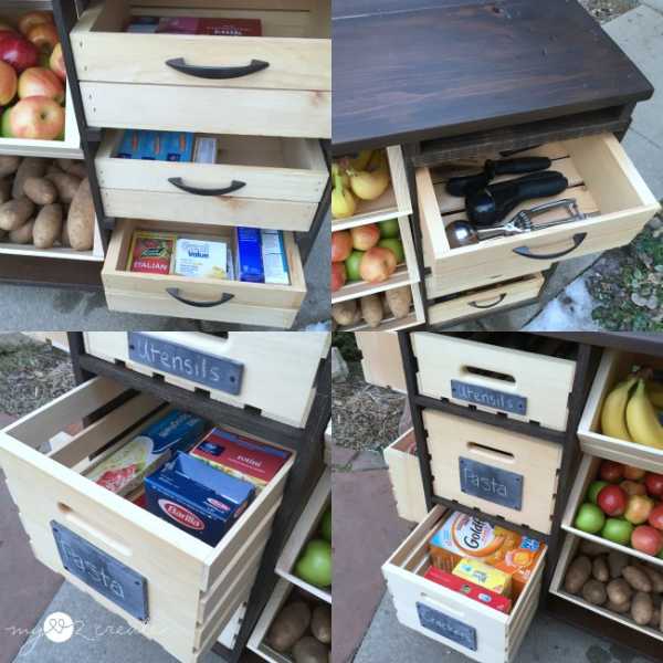 По высоте верхнюю столешницу можно использовать как стол, а в секциях хранить все, от овощей до столовых приборов.