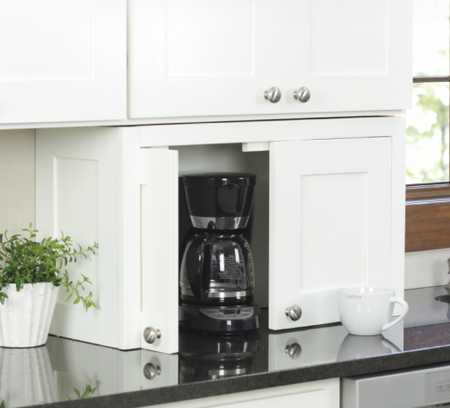 Ничто так не портит внешний вид красивой кухни, как стол, заставленный малой бытовой техникой. Но вы можете сделать встроенную полку с дверцей своими руками, как на фотографии, и решить проблему, теперь ваша техника будет аккуратно спрятана в шкафчике и в то же время постоянно находится под рукой.