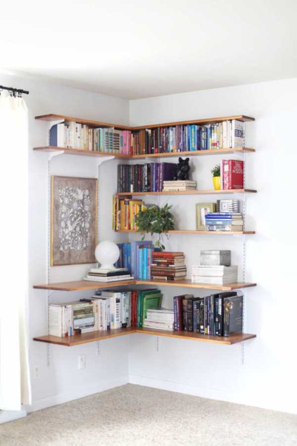 Прекрасно подойдет вариант полки, расположенной в углу, для любителей провождения времени за чтением книг.