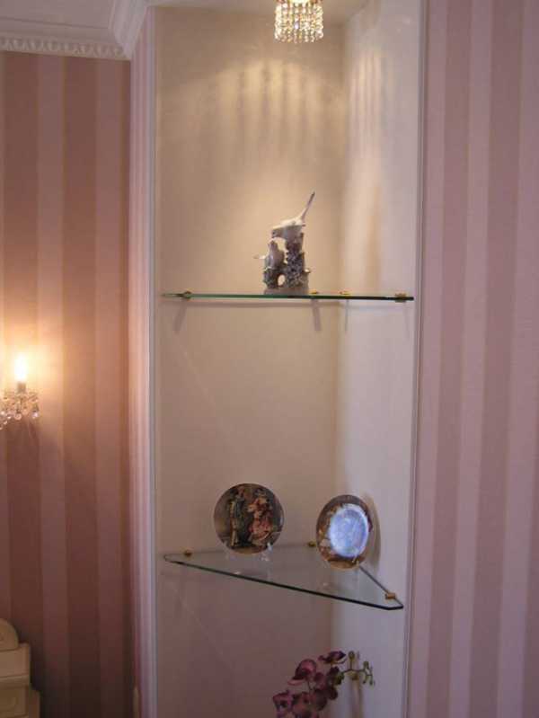 Полки, расположенные в углу универсальны и удобны, в то же время могут удивить изысканным видом.