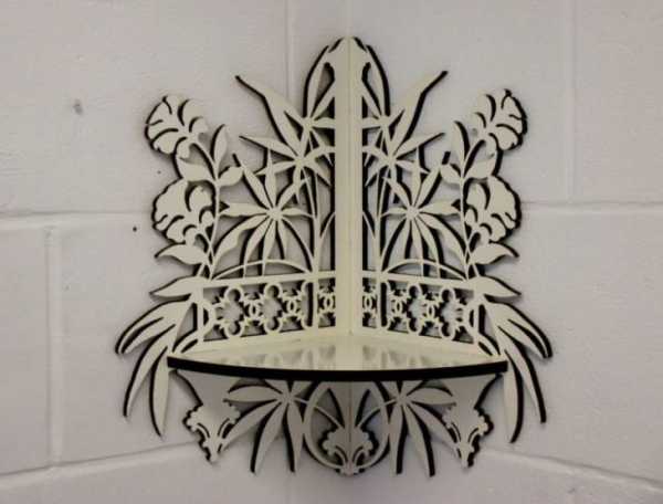 Сейчас большим спросом пользуются резные угловые полки. Они прекрасно вписываются в интерьер кухни, украшают помещение своим видом, выделяясь на фоне шкафов корпусной кухонной мебели. Их украшают ажурными деревянными деталями, которые вырезаются с использованием техники сквозной резьбы. Элементы получаются легкими, придают изделию воздушность.