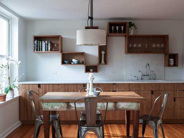 Открытая полка на кухне имеет некоторые преимущества, например, перед шкафами с закрытыми дверцами.