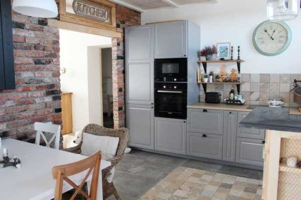 «Будбин», интерьер в стиле провансВ «Ютис» нет фронтов для напольных и навесных глухих шкафов. Их можно сочетать с фасадами других серий, подходящих по цвету – белыми или черными (смотрите фото ниже).