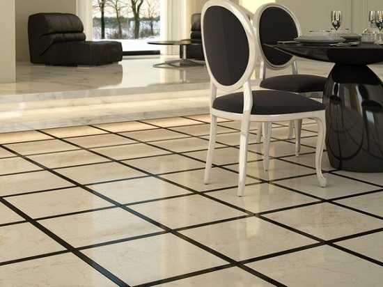 Один из способов монтажа напольного керамогранита — укладка с декоративными вставками. Чаще всего он применяется при облицовке однотонной плиткой или с рисунком «под мрамор» и «под дерево».
