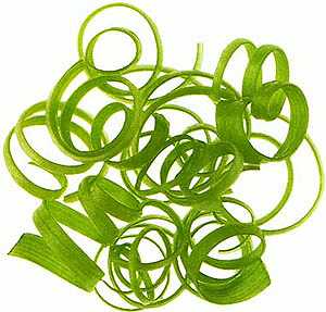 Стрелки зеленого лука, если их разрезать вдоль, сами собой свернутся в красивые «кудри». Можно для дополнительного эффекта погрузить их на несколько секунд в холодную воду. Чем холоднее вода, тем более скрученными будут полоски.