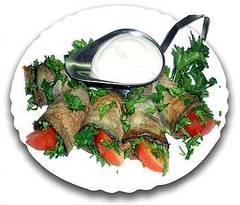 ![]() | Рулетики из обжаренных до золотистого цвета ломтиков баклажан с чесночком, дольками помидора и зеленью. |