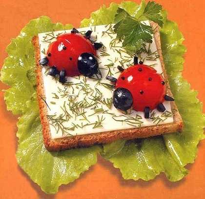«Божьи коровки» из половинок маленьких помидоров и кусочков оливков.