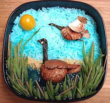 ![]() | Подкрашенный рис, нарезанные фигурной высечкой отварные овощи и сваренные вкрутую яйца. | |||