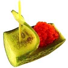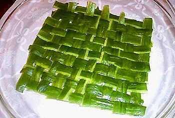 ![]() | На таком коврике из огуречной кожуры красиво смотрятся и закуски, и порционные мясо, рыба, курочка. | |||