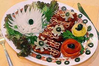 ![]() | Большое значение для оформления холодных блюд имеет правильное сочетание гарниров по вкусу, цвету, форме нарезки. | |