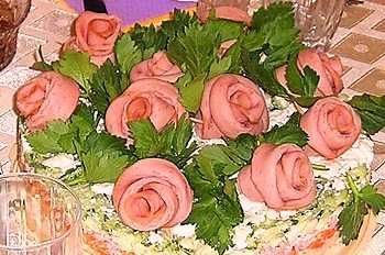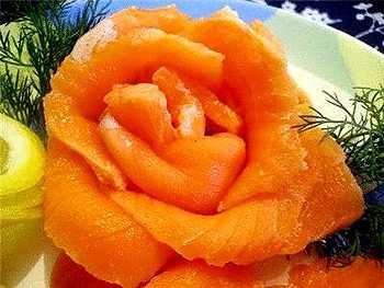 ![]() | «Розы», свернутые из ломтиков соленой рыбы — красной или белой (изготовление «роз» см. выше). | |||