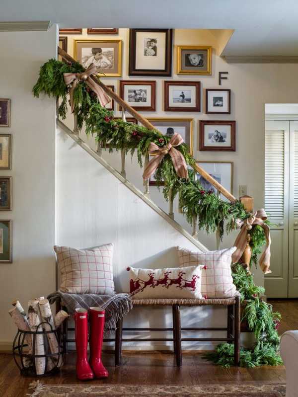 В большом загородном доме с двумя или тремя этажами, естественно, есть лестницы с красивыми перилами и фигурными балясинами. И значит, это хороший повод, чтобы декорировать и их тоже, для чего лучше использовать именно гирлянды.
